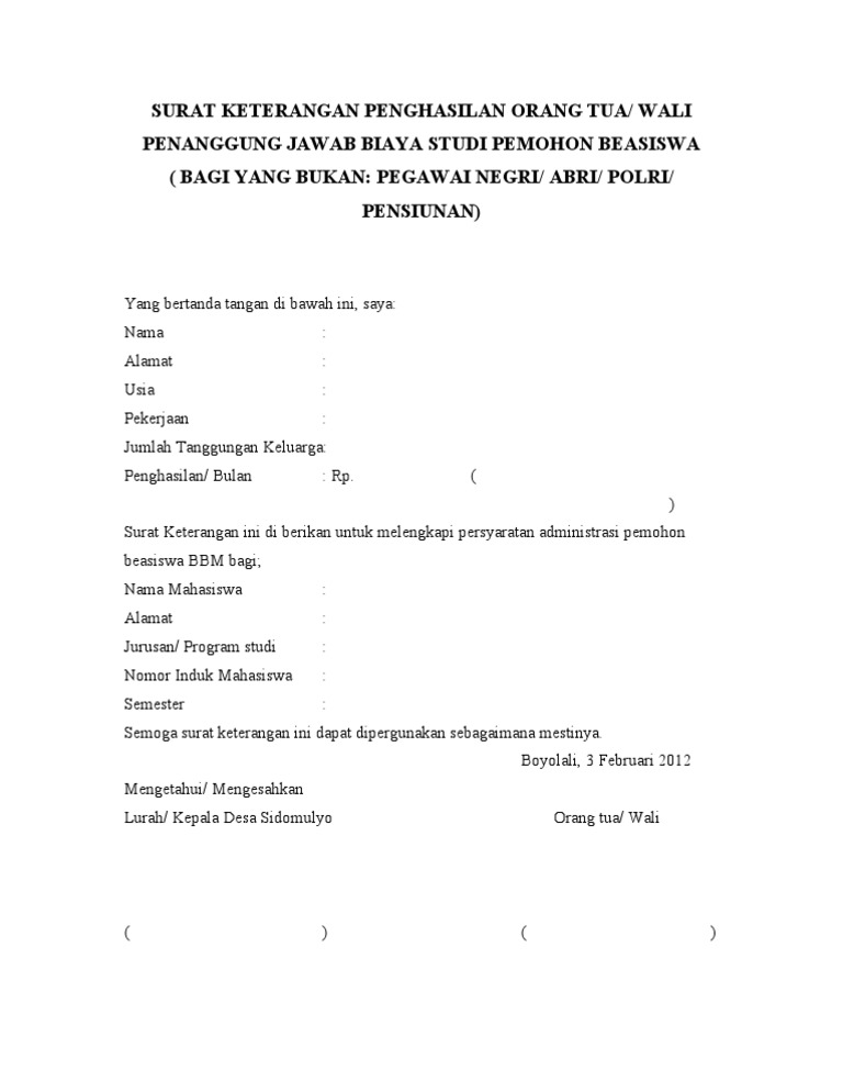 Misalnya wiraswasta, pedangan, petani, pns, tni, dll. Untuk menulis sebuah surat terutama jenis surat keterangan penghasilan orang tua untuk beasiswa, maka penulisannya tidak boleh asal. Untuk mendapatkan file contoh surat permohonan beasiswa kepada bupati, gubernur, pemda yang tidak diproteksi dan bebas untuk diedit, silahkan anda kunjungi situs kami. Contoh surat undangan rapat untuk orang tua wali murid.doc. Artikel ini sengaja saya buat untuk membantu kamu yang untuk kamu yang sedang mencari format surat keterangan, surat permohonan, surat rekomendasi, surat kuasa, dan contoh surat menyurat. Yang bertanda tangan di bawah ini : Surat keterangan penghasilan ini biasanya diterbitkan oleh atasan dari orang yang berkepentingan. Surat keterangan penghasilan ortu adalah suatu surat yang menerangkan tentang rincian pendapatan atau gaji orang tua total income per bulan dan juga berikut contoh surat yang menerangkan penghasilan orang tua untuk keperluan dalam mengajukan beasiswa untuk kuliah. Kalau kamu seorang karyawan, kamu bisa langsung mengajukan surat keterangan penghasilan. Untuk mendapatkan file contoh surat pernyataan penghasilan orang tua saya yang bertanda tangan di bawah ini : Nama orang surat keterangan ini diberikan untuk melengkapi persyaratan administrasi permohonan beasiswa ke (nama pemberi beasiswa atau jenis beasiswa). Dalam surat keterangan penghasilan orang tua juga biasanya menjelaskan biaya. Unduh file surat keterangan pengahasilan orang tua doc di sini.